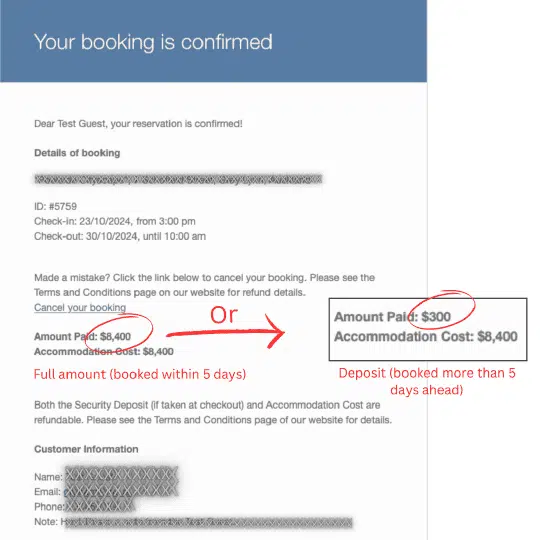 Guest confirmation email showing either the full amount or deposit paid.