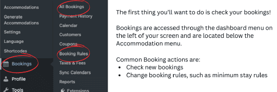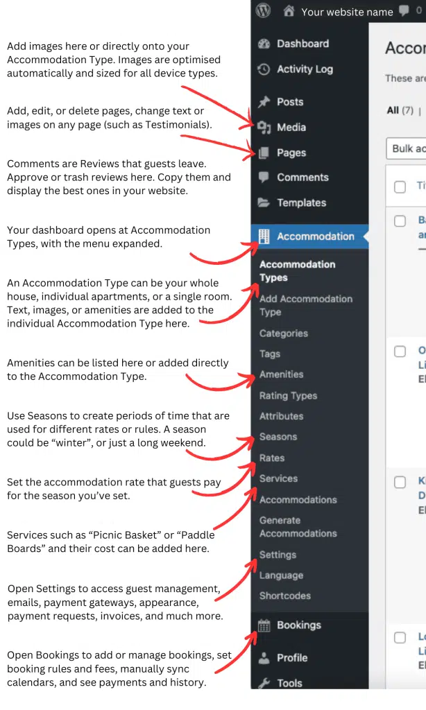 Your website opens at the admin dashboard with all the items that you need as the Accommodation Manager. The image below shows the most commonly used.
