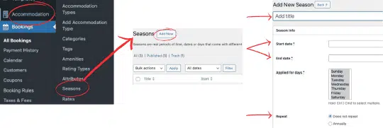 Give your Season a name, for example “Labour Weekend”. Set the start and end dates, and decide if the season should repeat (only if the dates don’t change from one year to the next). Once you’ve finished, don’t forget to “PUBLISH” your changes.