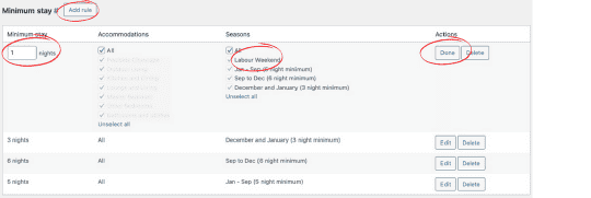 Choose the number of nights, the accommodation that it’s for (select ALL for a whole house), select the Season you want it to apply to, and click “Done”.